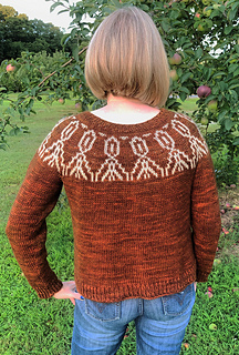 De eerste was de trui Cooped Up, en die heb ik gebreid voor mijn schoondochter. Zij is tamelijk stoer, en ook wel dol op de kippen die achter in de tuin wonen en zorgen voor een constante stroom van verse eitjes. Een mooie trui met een ingebreide rand van kippen (maar misschien zijn het wel hanen) was het resultaat. Van onder naar boven gebreid, dus het leukste kwam het laatst. Op de foto zie je mij, en ik heb een detailfoto van de sierrand toegevoegd. Mocht het je opvallen dat die kippen de andere kant oplopen, dat klopt: het zelfportret is in de spiegel genomen.